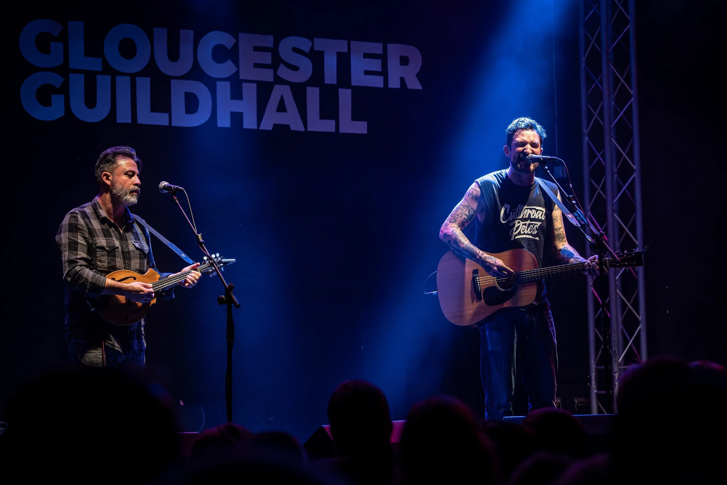 And then it was time for Frank Turner. Matt took the stage first and the full house rose on Frank's arrival. 'Don't Worry' kicked things off and quickly into 'Recovery' and 'The Lioness'. Frank explained how him and Matt used to play a lot of these duo shows but it has been a while since the last one and soundcheck was more of a rehearsal / recap of how to play some of these songs. Frank also explained the reason for being here "To fundraise for the school but mainly because Matt has some photos of me that he said he would release if I didn't do it !" . The banter between them flows easy, like two old friends doing a casual set down the local pub, but the songs are slick and executed flawlessly. Noting a large number of teachers in attendance there were frequent apologies for the swear words ("Sorry sir") and a plea to buy the special one off t-shirt because it was Franks idea and Matt would kill him if he has a box of t-shirts left over.