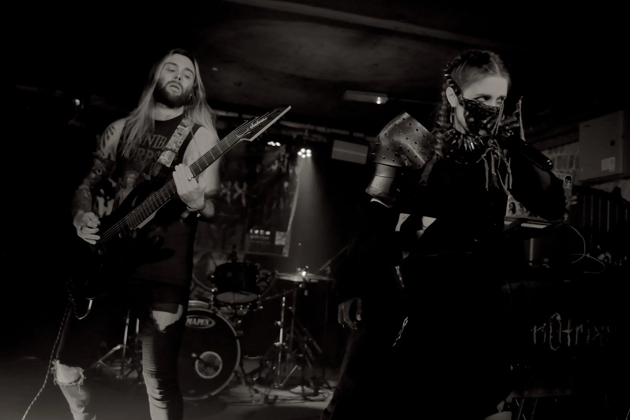 Bangor’s own Celavi opened the night with a set that felt like a ritual: PVC, lace, black‑and‑red aesthetics, and a pulsing electronic undercurrent that set the tone instantly. They’re a trio — drums, guitar, vocals, and a backing track that throbbed through the Cavern like a heartbeat.